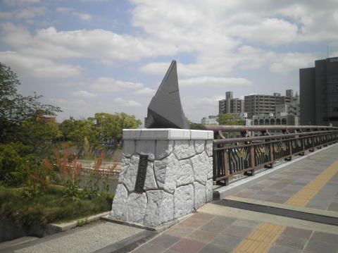 | 12:45 スタートして 商店街の外れにある「白川」へ 親柱の上のモニュメントは「清正の兜」? |