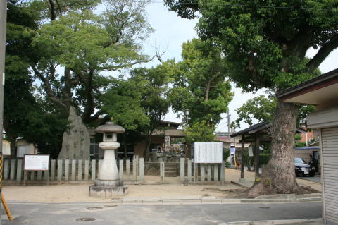 | 500m ほどで1本広い通りを過ぎて、さらに50mほど直進すると 右手に石灯篭 右折した先に こんもりとした神社のようなものが見えた |
