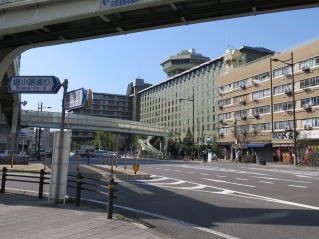 | 「堀川塩小路」交差点 歩道橋を渡って 正面の建物 「リーガロイヤルホテル京都」へ 降りてくる 通り越して ・・ 行ったり来たりして探し出したのは 「右の写真右下」 |