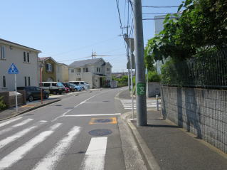 | 56.ふれあい歩道橋を渡る→ 58.葛が谷公園を左に見て直進→ 昼下がり 気温は30℃超 平日でもあり、歩いている人はあまり見かけない |