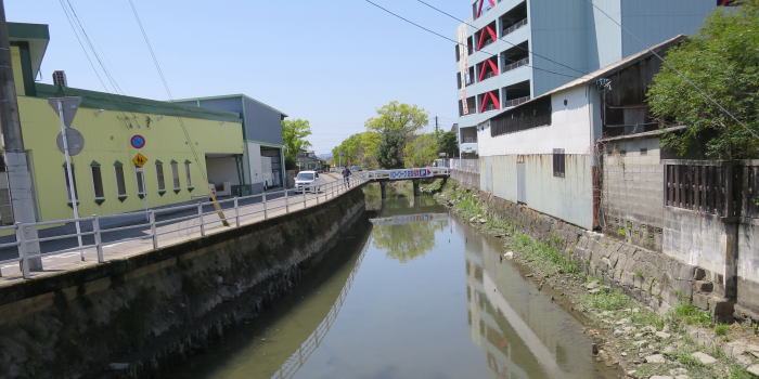| 「中央橋交差点」から、旧道?の「御幸橋」を渡って 運河?沿いへ MAPと微妙に川の角度が違うようだが ・・ 十間堀川 ・・ 説明板があり、この川沿いで間違いなし 旧藩時代、佐賀城下町の外濠の役割をもつ防衛上重要な川、 川幅は十間(18.2m)あったので この名があるが現在は狭くなっている。 流入する水路が多いので豪雨の際は氾濫しやすい。 ・・・ |