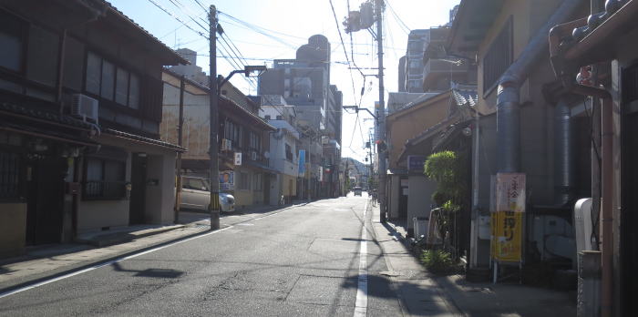 | 「旧三条四宮信号」で左折 土曜日の朝 ・・ 狭い通りだが、車が多い |