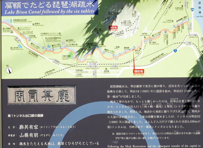| 見つけた看板「扁額で辿る琵琶湖疏水」 山縣有朋の「廓其有容(かくとしてそれいるることあり)」 疏水をたたえる大地は、奥深くひろびろとしている 解説にある「明治維新後、京都の活性化を目指して 疏水を開いた」 ・・ 以前「ぶらタモリ」で見た話 |