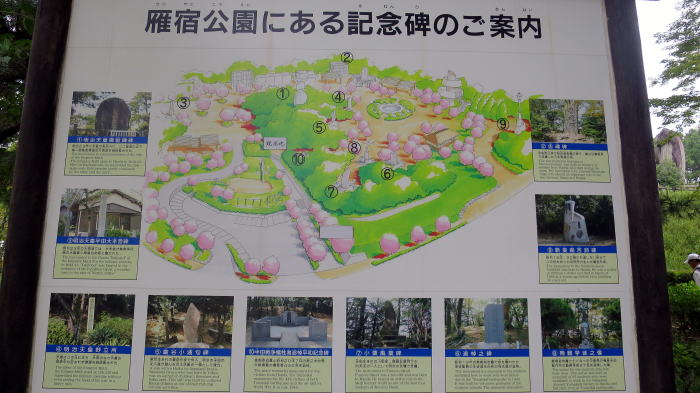 | 公園内にある記念碑 「明治23年に天皇が、ここ雁宿の丘で第一回陸海軍連合大演習を御統監」にまつわるもの 巌谷小波句碑(童話作家で俳人) 小栗風葉碑(半田生まれの小説家) 新美南吉詩碑(昭和18年 30歳にも達しない若さでこの世を去った童話作家) 忠魂碑(乃木希典大将の書)・(東南海地震)追悼之碑・半田戦争 ・・・ など |
