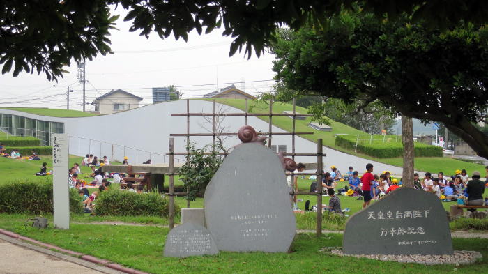 | 1200 「新美南吉記念館と童話の森」 到着 芝生では、小学生たちがお弁当を広げていた 隣には 保育園の年長さん達の賑やかな声 「13時まで 昼食休憩にします」 奥の「波波」の下が 「南吉記念館」 |