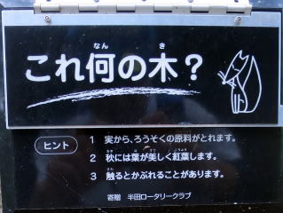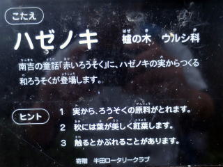 | 遊歩道の樹に 「これ何の木?」の質問 カバーの下に「答え」 南吉の童話「赤いろうそく」に、ハゼノキの実からつくる和ろうそくが登場します 「南吉の童話」の説明にもなっているのが ポイント |