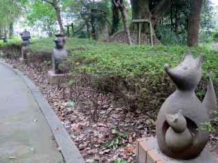 | 感じの柔らかな「キツネやでんでん虫」のオブジェ達 説明文に 「聖(せい)」 小西洋平 自然界にある、足元にある土で、 自然界の炎で焼き上げた、 自然界に生きるキツネ、でんでん虫。 |