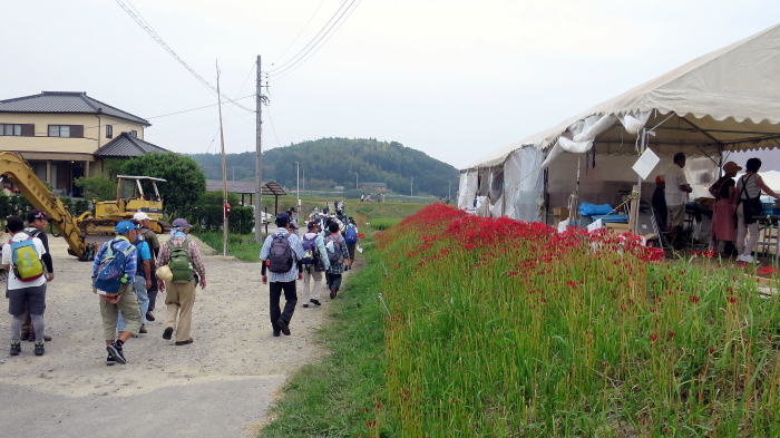 | リーダーさん 記念撮影以外は ずんずん進んで 群生地を抜ける 「1週間ほど早かった?」のかもだが、きっちり 「彼岸」に合わせて咲くのがすごい この辺りが、コース最北端 |