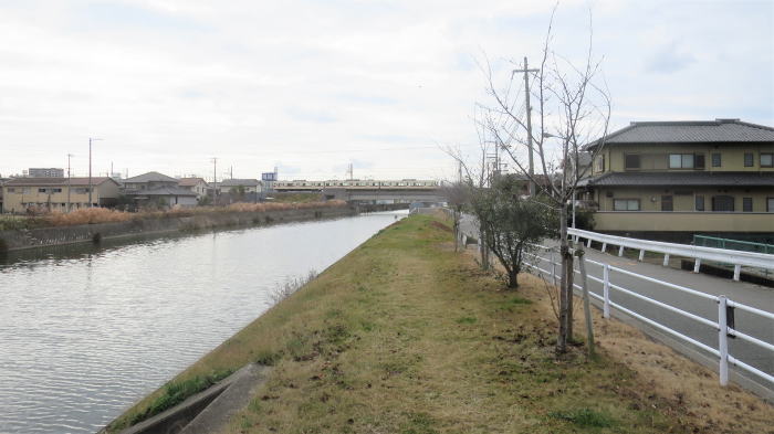 | 「津田細江橋」 を通過 前方を 「山陽電鉄:網干線」 の電車が通過して行った 基地の最寄り駅が 歩き初めに通った「山電飾磨駅」なので ゴールは近い |