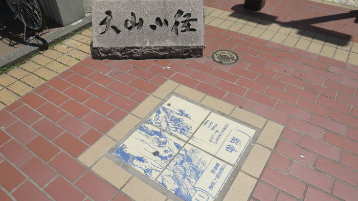| 「高津交差点」 を通過 WST 直前の公園までの 30mが整備され 「大山小径」 石碑と 「大山街道」にまつわるタイル絵 |