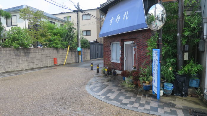 | 住宅地を 100m 進んで 突き当りの トレンディコンビショップ前で左折(北上) 何の店か不明 ・・ 廃業したのか、シャッターの文字が かろうじて読めた 隣は大きな工場で、どうやら サントリー京都 ビール工場のようだ |