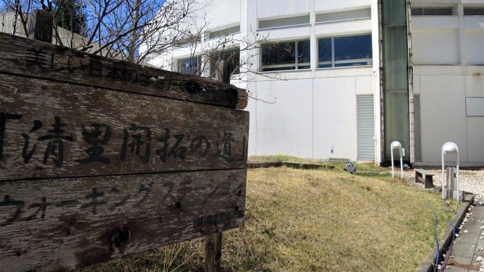 | 建物の前に 美しい日本の歩きたくなる道500選 清里開拓の道 ウォーキングステーションの 大きな看板 |