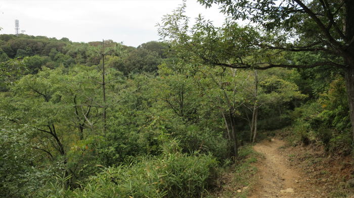 | 「山頂からは憩の森広場へ 尾根道を進みテレビ中継所を目指す」 正面にアンテナ塔が見えているが 谷の向こう側 |