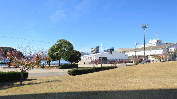| 広島みなと公園内で休憩(トイレ有)後 同公園西口出口Kへ 広い公園の 西口出口 ・・ 見当を付け進んだが 西南出口だったらしい |