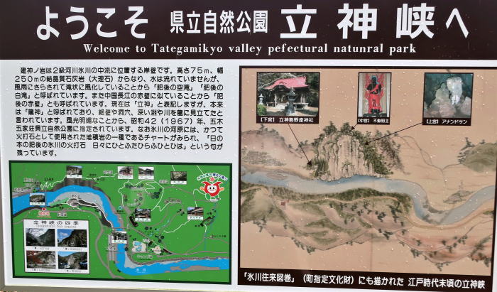 | 建神ノ岩は2級河川氷川の中流に位置する岸壁です 高さ75m幅250mの結晶質石炭岩(大理石)からなり、 水は流れていませんが、風雨にさらされ滝状に風化したことから 「肥後の空滝」「肥後の赤壁」とも呼ばれています ・・・ |