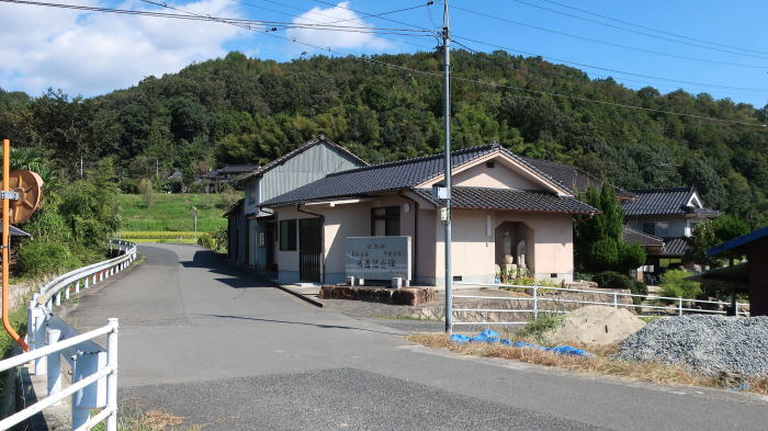 | 「徳永集会所:薄いピンク色の壁が目印」 壁の色は 更に薄くなっていたが 看板で確認出来ました その先から 「上り坂がきつくなります」 「ここから 尾道ふれあいの里まで上りが続きます」 ともある コースMAPの真ん中 中間点まで上りが多いようだ |