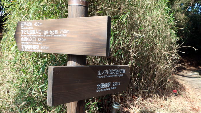| ・・ 車止めのある道へ突き当たる N 車止めの先、急な下り坂を下ると 左側に鎌倉教養センターの看板がある 車止めの先 急な下り坂を下りて |