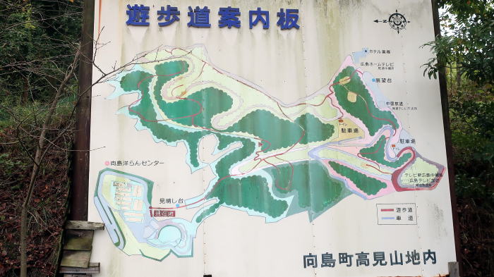 | T字路にぶつかり 向島洋らんセンター方面へ左折(右側通行) 案内板が読み辛い 島の中央部で コース最南端 左折して 東に向かう 島の最高峰:高見山も近そう |