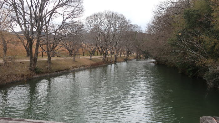 | 酒津公園を出て 西の用水路沿いを北上 左の公園遊歩道の建物先に 矢貼りが見える |