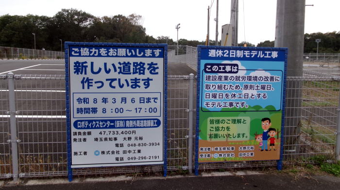 | 100mに ロボティクスセンター(仮称)南側外周道路舗装工 〜 令和8年3月6日 請負金額まで 表示している看板は なかなか 新鮮 |