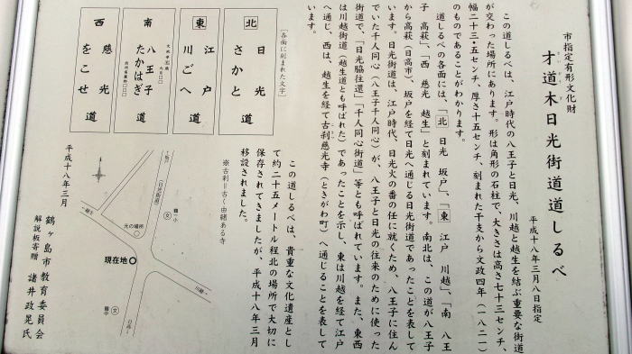 | MAP:才道木日光街道道しるべ 八王子と日光、川越と越生を結ぶ重要な街道が交わった場所にあります ・・ 日光脇街道や千人同心街道 等とも呼ばれていた 43.信号丁字路 (タカザワ歯科? 共栄ガス) 右折 44.(43)渡り 左折 43.横断歩道で 反対歩道に移り 200m 北上 |
