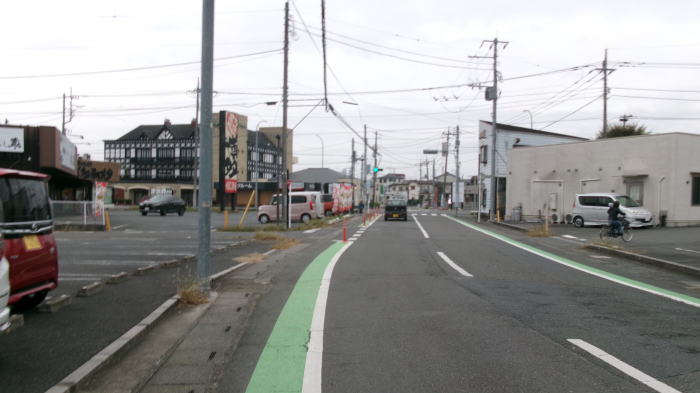 | Eで 左折したところ 右に 月極め駐車場 駅が近づき 飲食店などが増えてくる |
