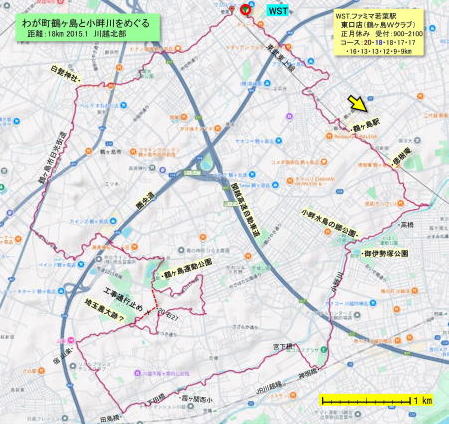 | めずらしく 圏央道での渋滞がないと思ったが ・・ 終点:関越 鶴ヶ島IC.近くになり 渋滞情報 関越手前の 圏央:鶴ヶ島IC.で下りて 東武東上線:若葉駅そばに駐車 1045 駅東口に回って WST:ファミマさんへ (鶴ヶ島ウォーキングクラブ) 多分 3回目の訪問で 今回は冒頭の18qコースを歩くことに |
